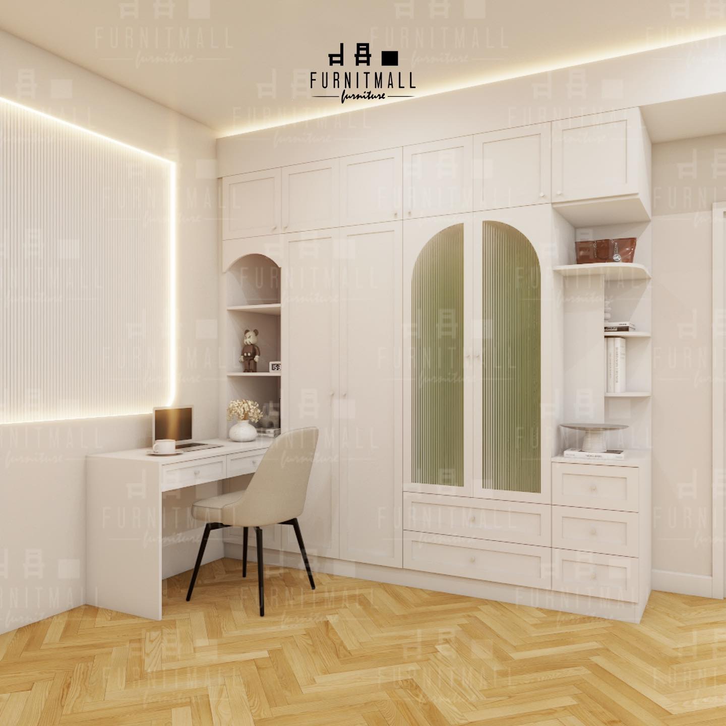 โซนตกแต่งและจัดเก็บ: มุมขวาของตู้ประกอบด้วยชั้นวางของโค้งมน และลิ้นชัก 4 ช่องเล็ก ช่วยให้ห้องดูเป็นระเบียบและมีมิติ