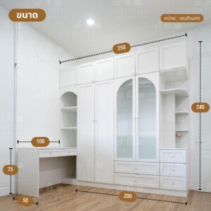 แม้จะเน้นเรื่องความสวยงาม แต่ฟังก์ชันก็ไม่แพ้ใคร ด้วยขนาดรวมทั้งชุดกว้างถึง 250 ซม. สูง 240 ซม. แบ่งสัดส่วนการใช้งานออกเป็น 3 โซนหลัก: