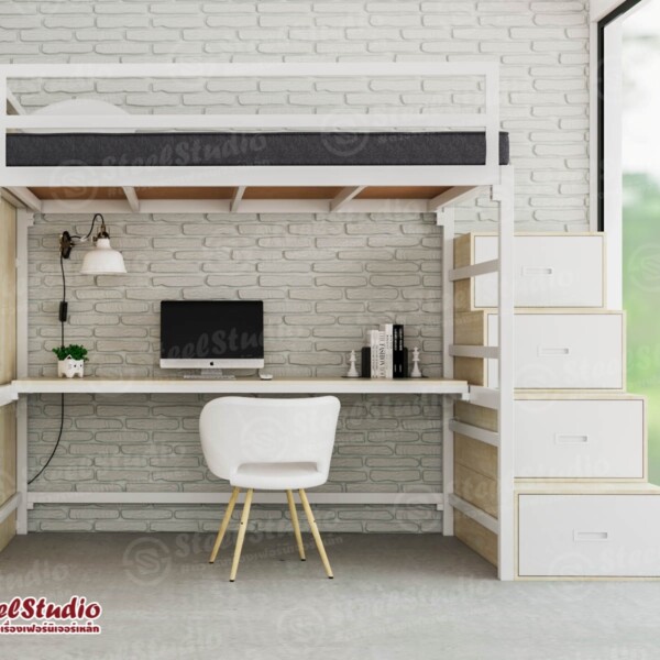 เตียงสูงพร้อมโต๊ะทำงานเล็กวางข้าง และกล่องบันไดทางขึ้นด้านหน้า